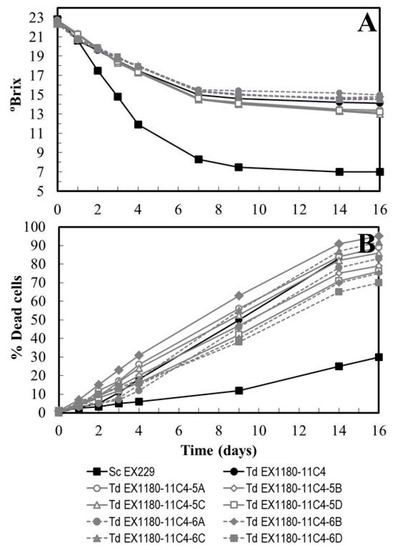 Yeast cells were cultured in YEPD broth for 2 days at 30 °C, washed twice with sterile water, and inoculated into synthetic must or synthetic base wine (2–4 × 10 6 cells/mL for S. cerevisiae, and 2–4 × 107 cells/mL for T. delbrueckii). In parallel, a fermentation inoculated with Sc EX229 or Sc 85R4A was done as a reference positive control for each experiment. Fermentations were performed in 250 mL Erlenmeyer flasks with 60 mL of must or base wine, at 20 °C or 16–18 °C, respectively. Before base wine inoculation, when required, yeast cultures were adapted to growth in this medium as indicated below for sparkling wine making, using the different culture shaking procedures mentioned in the Results section. The density, °Brix, yeast growth (total and viable yeast cells), and dead cells were monitored. Cell death was determined by staining with methylene blue and the observation of yeast samples under a microscope with a Nomarski 60× objective. Since the morphological changes in the yeast cells during the second fermentation of sparkling wine was highly variable, the total amount of dead cells was calculated as the sum of blue, empty, and destroyed/autolyzed cells [12].