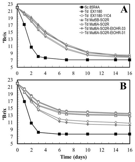 Fermentation kinetics of T. delbrueckii SO2 resistant mutants (Td Mut5B-SO2R and Td Mut6A-SO2R) and SO2 + ethanol resistant mutants (Td Mut6A-SO2R-EtOHR-31 and Td Mut6A-SO2R-EtOHR-33) in synthetic must (A) and synthetic must containing 50 mg/L SO2 (B). Data are the mean values of three fermentations inoculated with each yeast strain. Standard deviations were less than 10% of the means. The degree of dominance throughout fermentation of each inoculated yeast strain was 100%.