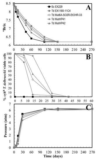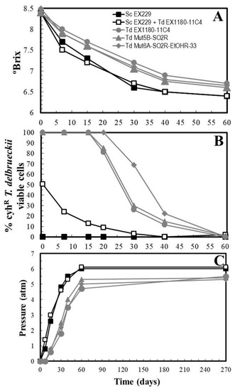 Recently, trials using T. delbrueckii for sparkling wine making have been carried out. Some strains of this yeast can be inoculated in the first-fermentation of grape must to obtain base wine with improved quality [7,12]. However, these strains were unable to complete the second-fermentation of the base wine because they cannot survive above 3.5 atm of CO2 pressure inside a glass bottle of sparkling wine [12]. As a consequence, base wine single-inoculated with T. delbrueckii only completed second-fermentation when there were contaminant Saccharomyces yeasts, which became dominant after CO2 pressure rose above 3 atm, while T. delbrueckii progressively became inviable [2]. Therefore, high CO2 pressure is another factor that decreases the competitiveness of T. delbrueckii compared to its potential competitor S. cerevisiae. This suggests that its resistance to high pressure should be improved if any dominance of T. delbrueckii during second fermentation of sparkling wine is intended.