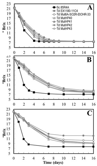 These eighteen HPR mutants were inoculated into Macabeo grape must, synthetic must, and synthetic must with 100 mg/L SO2. Fermentative vigor and the ability to complete fermentation were analyzed. Some improvement was observed for some HPR mutants (such as Td MutHP41 and Td MutHP42) with respect to their parents in fresh grape must fermentations (Figure 5A), but this improvement was less clear in synthetic must (Figure 5B). Fermentation kinetics were in most cases faster in fresh grape must than in synthetic must, and were even slower when 100 mg/L SO2 had been added. This was especially evident for the Td EX1180-11C4 yeast, which is the most sensitive to SO2 and ethanol. The HPR mutants had faster fermentation kinetics than their parental yeast Td Mut6A-SO2R-EtOHR-33, being less affected by the presence of SO2. Unfortunately, no mutant completed this type of fermentation within 16 days, which is more than twice the time (seven days) required by the Sc 85R4A reference yeast to complete fermentation (Figure 5C). All these results indicate that the synthetic must fermentation conditions were so severe that SO2 resistance of the mutants was not a definitive advantage for the completion of fermentation. Once again, it seems that the high and rapid increase of ethanol concentration in this type of fermentation was the limiting factor for maintaining the viability and fermentation rate of T. delbrueckii yeasts, even though the new mutants were resistant to SO2 and this compound was present, or even that they were more resistant to ethanol and CO2 pressure than their parental yeast.