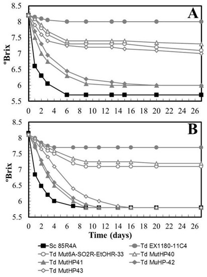 However, most HPR mutants showed a relevant improvement in synthetic base wine fermentations supplemented with 50 mg/L SO2 (Figure 6A). Furthermore, they were able to complete the fermentation when the amount of SO2 was reduced to 30 mg/L just 3–4 days after the reference yeast Sc 85R4A. Only one of the selected mutants, MutHP40, did not improve with respect to its direct parental strain Td Mut6A-SO2R-EtOHR-33 (Figure 6B). This SO2 concentration is similar to that commonly used in the cava-type sparkling-wine industry (between 15 and 25 mg/L). Therefore, the two mutants with the best fermentation kinetics, Td MutHP41 and Td MutHP42, were selected because, in the presence of 30–50 mg/L of SO2, they showed great improvements over their original parental yeast (Td EX1180-11C4) and the intermediate mutant (Td Mut6A-SO2R-EtOHR-33) from which they directly proceeded, and also because they were the mutants whose fermentation kinetics were closest to that of the reference yeast Sc 85R4A. Considering the number (18) of initially pre-selected HPR clones, one can estimate an 11% success rate in our strategy to obtain new improved strains of T. delbrueckii for base wine fermentation. However, only some HPR mutants improved the capability for synthetic must fermentation compared to their parental yeast, and this improvement was of little relevance because they did not complete the fermentation in a time that is reasonable for the commercial production of still wines. As noted above, this may be because the increase of ethanol concentration during must fermentation is much greater and faster than in sparkling wine fermentations. In other words, a different, more specific strategy from that used in this present work is probably required to improve the efficiency of T. delbrueckii yeasts for still wine fermentation. It was not enough to select mutants resistant to SO2 and ethanol in supplemented culture plates, or HPR mutants capable of better resisting the CO2 pressure during the slow second fermentation of traditional sparkling wine.