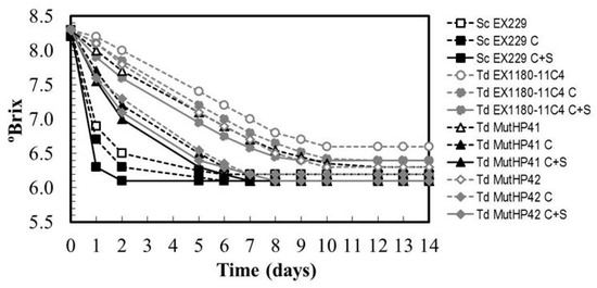 Since T. delbrueckii has a higher oxygen requirement to grow than S. cerevisiae, we tested two protocols to condition the yeast cultures prior to inoculation of base wine (30 mg/L SO2): one with occasional shaking every 4–12 h (as is usually done to make commercial sparkling wine), and another with continuous shaking. In this way, one can evaluate how the oxygen supply during the adaptation of these yeasts to the base wine environment improves their resistance to ethanol, and hence their fermentation capability. Occasional shaking improved the fermentation capability of all the yeasts, including the S. cerevisiae reference strain which already had excellent fermentation capability even without previous culture conditioning. The most relevant improvements were again found for Td MutHP41 and Td MutHP42. Continuous shaking further improved the fermentative capability of all yeasts, and especially that of T. delbrueckii yeasts. Interestingly, Td MutHP42 improved its fermentation capability to values close to S. cerevisiae after seven days of fermentation (i.e., once the fermentative capability of the new Td MutHP41 and Td MutHP42 mutants had been improved with respect to the parental T. delbrueckii yeast, it was still possible to further improve their base wine fermentation efficacy by prior conditioning with continuous shaking to provide extra oxygen to the yeast culture) (Figure 8). However, since the fermentation capability of these mutants was still less than that of S. cerevisiae, involvement of this latter yeast may still be necessary to ensure that the second fermentation of sparkling wine is completed in a reasonable time for commercial wineries, preferably within two months. The novelty when using these new HPR mutants, conditioned with continuous oxygen supply, is that they would stay alive longer than their parental yeast during second fermentation inside the bottle, thus giving the wine more of the organoleptic characteristics of T. delbrueckii. Furthermore, this is particularly interesting in reducing the inoculum size of these yeasts to the level normally used for S. cerevisiae (from 1–2 × 107 to 1–2 × 106 CFU/mL. This would mean lower economic costs and could prevent the appearance of odors related to the production of H2S due to the accumulation of excess amounts of dead yeasts.
