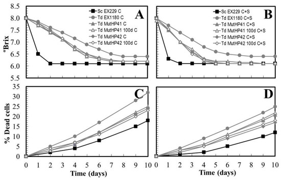 Genetic stability of the new HPR mutants after 100 doublings in rich non-selective culture medium (YEPD) was analyzed as previously described [41]. All the mutants maintained the genetic markers after 100 doublings. They also maintained their fermentative capability (Figure 9A,B) and the ability to remain viable longer than their parental strain (Figure 9C,D) throughout the fermentation of synthetic base wine, regardless of the type of culture conditioning protocol used (Figure 9A,C, vs. Figure 9B,D). This indicates that Td MutHP41 and Td MutHP42 are genetically stable enough to be considered for production at the industrial scale and marketed for use in industrial cellars, with no apparent risk that they might easily lose their new biotechnological properties. We are currently preparing to test these new mutants in commercial cellars for several consecutive years to validate their capability to improve sparkling wine quality, or to make differentiated alternative wines.