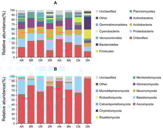 Relative abundance of bacteria (A) and fungi (B) at the phylum level. AR, BR, CR, and DR indicates rhizosphere soil sample in spring, summer, autumn, and winter, respectively. AN, BN, CN, and DN indicates non-rhizosphere soil sample in spring, summer, autumn, and winter, respectively. n = 3.
