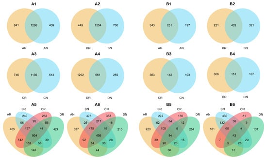 Venn diagram of bacterial (A1–A6) and fungal (B1–B6) Operational taxonomic units (OTUs). AR, BR, CR, and DR indicates rhizosphere soil sample in spring, summer, autumn, and winter, respectively. AN, BN, CN, and DN indicates non-rhizosphere soil sample in spring, summer, autumn, and winter, respectively. Overlaps and non-overlaps indicate shared and exclusive OTUs under different samples, respectively. n = 3.
