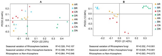 Principal Co-ordinary Analysis (PCoA) of bacterial (A) and fungal (B) community based on unweighted unifrac distance. AR, BR, CR, and DR indicates rhizosphere soil sample in spring, summer, autumn, and winter, respectively. AN, BN, CN, and DN indicates non-rhizosphere soil sample in spring, summer, autumn, and winter, respectively. Values of R2 and P were calculated using Permutational MANOVA (Permanova). n = 3.