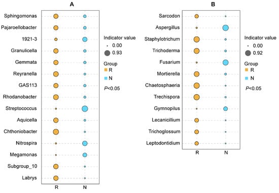 Bacterial (A) and fungal (B) biomarkers of the rhizosphere (R) and non-rhizosphere (N) samples at the genus level based on indicator analysis. The size of the cycle indicates the indicator value of each genus. n = 3.
