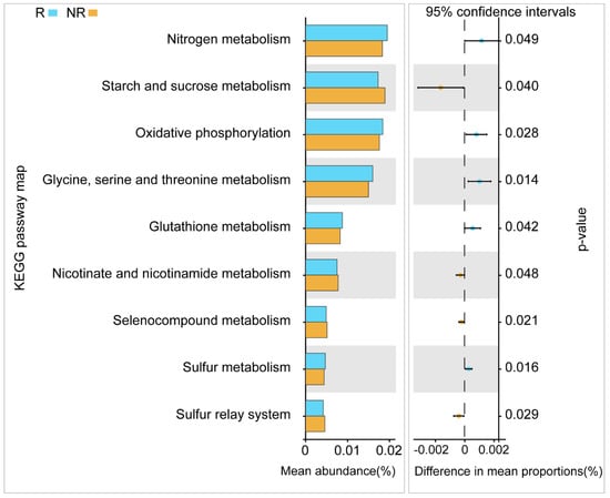 The difference Kyoto Encyclopedia of Genes and Genomes (KEGG) map of bacteria between rhizosphere (R) and non-rhizosphere (NR) based on Welch’s t-test. n = 3.