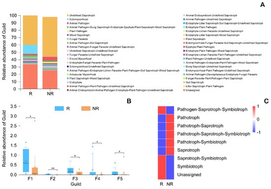 Distributed stack diagram (A) of fungal functional group (Guild), box figure of different fungal functional group (Guild) based on Wilcoxon rank-sum test (B), and the heatmap of fungal functional trophic mode (C). R and NR indicated the rhizosphere and non-rhizosphere, respectively. F1, F2, F3, F4, and F5 indicated Fungal Parasite-Undefined Saprotroph, Ectomycorrhizal-Undefined Saprotroph, Endophyte-Litter Saprotroph-Soil Saprotroph-Undefined Saprotroph, Endophyte-Litter Saprotroph-Wood Saprotroph, and Ectomycorrhizal-Fungal Parasite-Soil Saprotroph-Undefined Saprotroph. * and ** over the box indicated a significant difference at 0.05 and 0.01 level, respectively. The black line and hollow cycle in the box indicated the median and mean (n = 3) abundance of Guild, respectively. The solid rhombus beyond the box indicated the discrete data. The top and down line of box indicated 25% and 75% of Guild. The top and down line beyond the box indicated 10% and 90% of Guild.