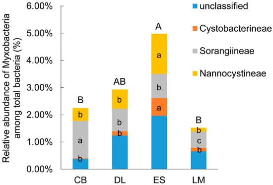 The relative abundance and community composition at the suborder level of soil myxobacteria among total bacteria from subtropical and tropical forest soil. The different uppercase letters above each column indicate significant difference of total myxobacteria abundance among sampling sites, and the different lowercase letters embedding the center of each stacking indicate significant difference of each suborder abundance among sites (p < 0.05, Tukey’s multiple range test). CB, Chebaling (subtropical forest soil); DL, Diaoluoshan (tropical forest soil); ES, Esongling (tropical forest soil); LM, Limushan (tropical forest soil).