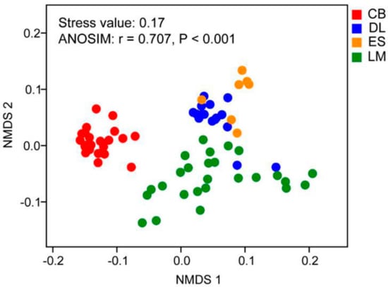 NMDS of Bray–Curtis similarity matrix of soil myxobacterial community from subtropical and tropical forest soil based on amplicon sequence variants (ASV) abundance. Stress value and analysis of similarity are shown in the upper left of the graph. CB, Chebaling (subtropical forest soil); DL, Diaoluoshan (tropical forest soil); ES, Esongling (tropical forest soil); LM, Limushan (tropical forest soil).
