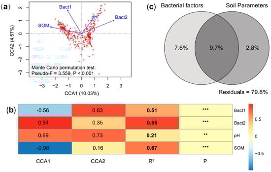 The contribution of soil abiotic and bacterial factors affecting myxobacterial community of subtropical and tropical forest soil. (a) CCA of soil myxobacterial community composition constrained by soil bacterial community (Bact1, Bact2) and soil abiotic parameters (pH, SOM); Bact1 and Bact2 indicate first and second principal components generated from PCoA using soil microbial community composition data (the first and second principal components explained 57% of the variation of the 71 soil bacterial communities). (b) Correlations between ordination axis and constrained factors and their significance indicated by Monte Carlo permutation test; R2 means the effect size of specific factor on soil myxobacteria, and p < 0.05 indicates a significant effect on myxobacterial community. (c), VPA indicated the effects of soil abiotic and bacterial factors on the myxobacterial community composition; the data present the percentage of variations explained by the factors.