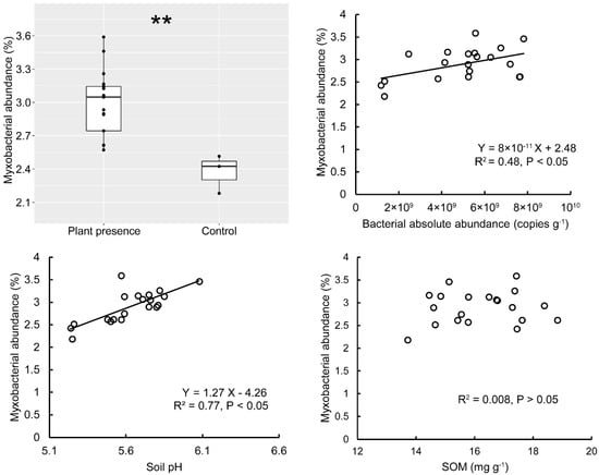 The relative abundance of soil myxobacteria and the correlation with soil bacteria abundance, soil pH and SOM content from the greenhouse mesocosms experiment. The asterisk (**) indicates significant difference between plant presence and the no-plant control. Linear functions, coefficients and p values are used to describe the significant correlations.