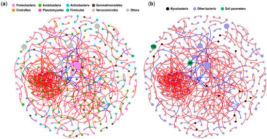 The co-occurrence networks showing the associations of soil myxobacteria, other bacteria and soil parameters (pH, SOM). (a) The nodes coded with different colors represent individual ASV and soil parameters. (b) The nodes coded with different colors represent myxobacteria, other bacteria and soil parameters. The edges connecting nodes correspond to statistically significant correlations between nodes and the edges in red and blue indicate positive interactions and negative interactions, respectively. Node size is the mean abundance of each ASV except the node representing soil parameter with constant size to distinguish from bacterial nodes.