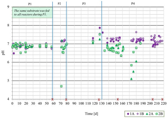 | P4 | 131–217 | The OLR was started at COD 2.3 g/L/d (SD 0.3) and thereafter changed, as illustrated in Figure 1. pH of substrate CH-1 adjusted to 7.1 (instead of 7.0) on day 143–160 and to pH 8.3 on day 161–177. Feeding terminated for 1A on day 211, 1B on day 217, 2A on day 173, and 2B on day 168. Average OLR 8.5 (SD 0.2) during days 183–201 for 1A and days 208–217 for 1B. |