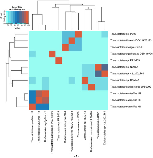 According to information available on the EzBioCloud server, strain PS06 was most closely related to Thalassotalea litorea HMF4135 (98.3% 16S rRNA gene sequence similarity), Thalassotalea ponticola GJSW-36 (95.9%), Thalassotalea agarivorans TMA1 (95.4%), and Thalassotalea fusca G-MB1 (94.9%). In addition, the phylogenetic tree based on 16S rRNA gene sequences showed that T. litorea, T. ponticola, T. crassostreae, and strain PS06 formed a cluster that was well separated from other strains in the genus Thalassotalea, and these strains were isolated from South Korea [3,12,49]. Based on the phylogenomic tree (Figure 1), strain PS06 clustered with T. litorea and Thalassotalea mangrovi [4], and three genomes (T. euphylliae H1, H2, and H3) isolated from corals in Hawaii, USA, formed a single cluster [10,11,14]. This result indicated that some species of the genus Thalassotalea might have more genomic relatedness than sequence similarity in their 16S rRNA genes and occupy the same ecological riches based on evolutionary relationships [50,51].