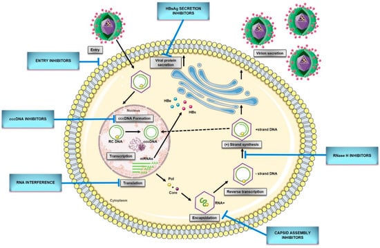 The replication cycle of HBV (Figure 1) begins with the reversible binding of the small envelope protein (S-HBsAg) to heparan sulfate proteoglycans (HSPG) on the hepatocyte membrane (Figure 1) []. Recently, Verrier et al. [] demonstrated that glypican-5 (GPC5), a protein associated with proteoglycans, functions as an attachment factor during the entry of HBV. Following the proteoglycan binding, a specific HBV entrance receptor, Sodium Taurocholate Cotransporting Peptide (NTCP), is recognized by the preS1 region of HBV large envelope protein (L-HBsAg) and it is the N-terminal myristoylated peptide corresponding to amino acids (aa) 2–48 of the pre-S1 that binds to NTCP with high affinity []. Upon entrance, capsids are transported within the cytosol to the nucleus during which uncoating and release of the viral genome is initiated. Once the rcDNA enters the nucleus, it undergoes processing to be converted into viral replication intermediates, (covalently closed circular DNA, cccDNA), which is the template for transcription of all viral RNAs [,]. The cccDNA is a stable nuclear form of the viral genome representing the molecular persistent reservoir of HBV. The cccDNA exists in the hepatocyte nuclei as a minichromosome that can be modified by host histone proteins (H3, H4) and non-histone viral and cellular proteins (HBx, HBc, host epigenetics-related proteins). The cccDNA pool is highly stable in hepatocyte nuclei because cccDNA structure is hard to eliminate, and infection of new hepatocytes by progeny virions can be continuous [,]. Although HBV cccDNA lifetime is still unknown, it can persist throughout the natural lifespan of hepatocytes. Therefore, reactivation of viral replication from persistent cccDNA is the principal source of recurrence of clinical hepatitis in patients after stopping antiviral therapy, or after being immunocompromised due to chemotherapy, organ transplantation, immunosuppressive therapy, or coinfection with HIV. It has been established that only a few cccDNA copies per liver can reactivate full virus production. Hence, any cure of CHB requires the elimination of cccDNA or, at least, permanent silence to achieve a functional cure that is sustained undetectable HBV surface antigen (HBsAg) and HBV DNA levels in serum, with or without the appearance of antibodies to the HBsAg (anti-HBs) [,].
