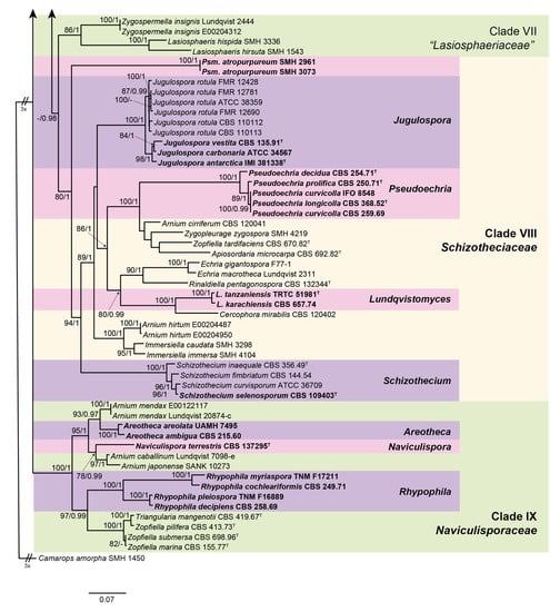 Notes: Rhypophila includes species formerly classified in a section with the same name in the genus Podospora [9]. Chang et al. [12] also noted that Podospora species of the section Rhypophila grouped together in the phylogenies based on ITS and a fragment of the glyceraldehyde-3-phosphate dehydrogenase (gpd) gene. Although the phylogenetic distance between R. cochlearifomis/R. myriaspora and R. decipiens/R. pleiospora suggests that these could represent two different genera, we decided to include all these species in Rhypophila based on the morphological resemblances. Further studies including more taxa are needed to clarify it. The genus Rhypophila is characterized by the production of ostiolate ascomata with a neck bearing elongated tuberculated projections at the base, asci normally containing more than eight ascospores, and ascospores with a lower cell as long as, or longer than, the upper cell. Ornamentation in the upper part of the ascomata is also present in Pseudoechria, Pseudoschizothecium, and Schizothecium, but these three genera, classified in the new family Schizotheciaceae (clade VIII, Figure 2), differ in the nature of the ornamentation (see Notes on Pseudoechria).
