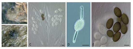 - Réblová, M. Bellojisia, a new sordariaceous genus for Jobellisia rhynchostoma and a description of Jobellisiaceae fam. nov. Mycologia 2008, 100, 893–901. [Google Scholar] [CrossRef]