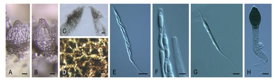 Naviculispora terrestris CBS 137295T. (A) Ascomata. (B,C) Asci. (D–F) Ascospores. (G) Conidia sessile. (H) Conidia borne on sympodially proliferating conidiophores. Scale bars: (A) = 100 μm; (B,C) = 20 μm; (D) = 15 μm; (E,F) = 10 μm; (G,H) = 5 μm.