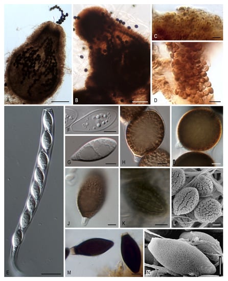 - Miller, A.N.; Huhndorf, S. Multi-gene phylogenies indicate ascomal wall morphology is a better predictor of phylogenetic relationships than ascospore morphology in the Sordariales (Ascomycota, Fungi). Mol. Phylogenet. Evol. 2005, 35, 60–75. [Google Scholar] [CrossRef]