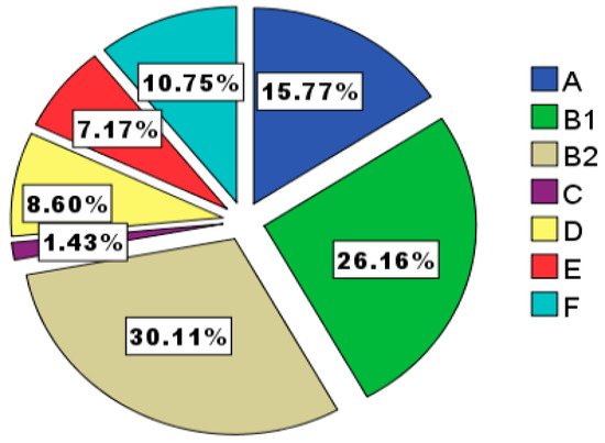Phylogenetic group distribution (including group A, B1, B2, C, D, E, and F) of E. coli in the anal swabs of dogs.