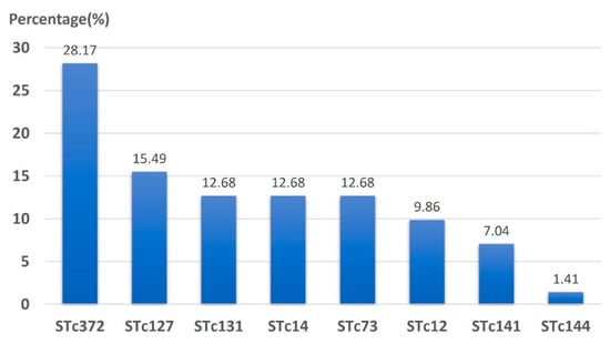 Among the 84 isolates of the B2 group, further clonal complexes could be found by multiplex PCR in 71 isolates. The distributions of common sequence type (ST) complexes are shown in Figure 2. The three most predominant ST complexes were STc372, followed by STc127 and STc131.