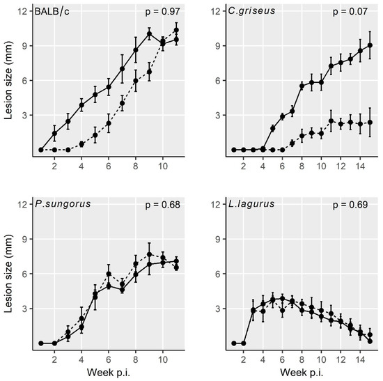 Lesions appeared very early in BALB/c mice (already on week 2 p.i.), one week later in P. sungorus and L. lagurus (in week 3 p.i.), and even later in C. griseus (week 4 p.i.). Compared to susceptible BALB/c mice, the growth of lesions was very similar in P. sungorus (p = 0.08); the lesions have an ulcerative character in both species (Figure 2a,b), and their size increased progressively until the end of the experiment. In some P. sungorus, the skin surrounding ears was also affected by redness and exuviation (Figure 2c). Experiments with BALB/c mice and P. sungorus were, therefore, finished on week 9–11 p.i. to avoid excessive distress to the animals. In L. lagurus, the lesion growth was significantly slower than in BALB/c mice (p < 0.0001), and although the character of lesions was initially also ulcerative (Figure 2d); their size increased only to week 7 p.i. and then began to reduce. These animals were able to resolve lesions by necrosis of affected parts, resulting in a reduction of the size of ear pinnae (Figure 2e). In C. griseus, lesion development was also significantly slower than in BALB/c mice (p = 0.0001); lesions were not ulcerative and were fully healed in some (3 out of 13) animals (Figure 2f, Table S2).
