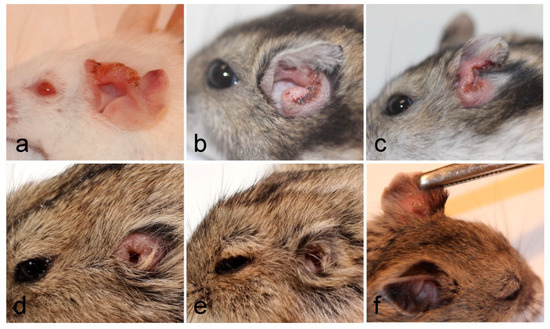 Inoculated ears of BALB/c mice (a), P. sungorus (b,c), L. lagurus (d,e), and C. griseus (f) showing external manifestation of L. major infections at the end of experiments.