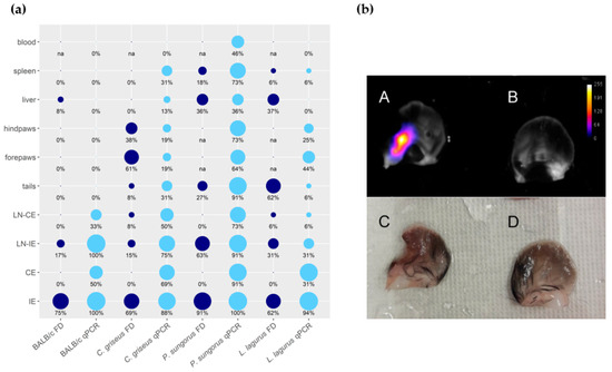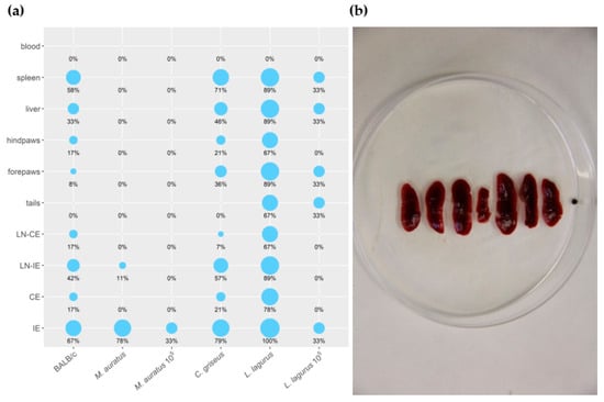 (a) Anatomical distribution of L. donovani in rodent species determined by qPCR. Results are presented by the balloon graph where the size of the balloon corresponds to the percentage of L. donovani infected organs from the total sum of tested organs of the same type. IE = inoculated ears; CE = contralateral ears; LN-IE = draining lymph nodes of the inoculated ears; LN-CE = draining lymph nodes of the contralateral ears. 105: Animals inoculated with 105 CDP. Animals that are not 105–labeled were inoculated with 107 CDP or SDP (b) Splenomegaly in L. lagurus infected with L. donovani in comparison with uninfected control animal (in the centre).