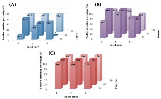 The largest differences between the extraction protocols having been obtained for the lowest oocyst concentrations (i.e., 10 and 50 oocysts/mL), we therefore investigated the impact of the speed and duration of the grinding step on extraction performances at low oocyst concentrations (i.e., 5, 10 and 50 oocysts/mL). Several combinations of grinding speed and duration with the Lysing Matrix E® (MP Biomedicals™) were tested on a FastPrep 24® grinder/homogenizer (MP Biomedicals™). Optimizing this step is essential in order to avoid potential DNA fragmentation and the release of PCR inhibitors. Differences in DNA extraction performances were observed depending on the mechanical pretreatment protocol used, especially at the concentrations of 5 and 10 oocysts/mL (Figure 1). The optimal performances were indeed obtained when combining a grinding duration of 60 s with a speed of 4 m/s. Finally, no difference was observed at concentrations > 50 oocysts/mL. Above this concentration, the variation of these parameters seems to no longer have any influence on the extraction performances. Thus, from a given concentration of oocysts/mL, the amount of amplifiable DNA, even qualitatively altered by a potential fragmentation, would no longer influence the positive percentage of PCR detection.