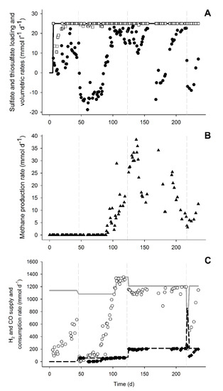 This can be observed by the increase of sulfate and sulfide concentrations in an approximately 1:1 ratio (Figure 1). During this period, in which no acetate was formed, the pH decreased and the CO2 fraction in the gas phase increased that was indicative of the water-gas shift reaction (Equation (1), Table 1, and Figure 1C). After 38 days of operation with 5% CO (day 84), the sulfate/thiosulfate reduction activity recovered. This activity was not further affected by an increase to 15% CO on day 124 (Figure 1A). Thiosulfate was completely reduced while 87 ± 3% of the sulfate was reduced during the stable phase with 15% CO (day 200 to 216). The sulfidogenic rate was similar to that achieved in a study with only H2 (42.3 ± 2.2 mmolS L−1 d−1), when applying the same sulfate/thiosulfate loading rate [23]. The sulfidogenic rates (rvs) achieved almost matched the loading rates of sulfate and thiosulfate (Figure 2A). This indicated that sulfidogenic rates could be higher if loading of sulfate and thiosulfate was increased as described for other sulfate and thiosulfate reducing bioreactors (Table 3). Moreover, increasing the length of the different stages may contribute to a further increase in the sulfidogenic rates.