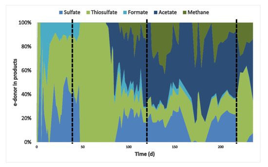 Besides sulfate and thiosulfate reduction, acetate, formate, and methane were produced (Figure 1a,b and Figure 2b). Acetate production started after the inhibition period on day 76, probably using hydrogen and/or CO as electron donors. It was not possible to distinguish if either H2 or CO were specifically used as H2 and CO were simultaneously consumed (Figure 2c). However, looking at the overall electron donor consumption (H2 + CO), acetate production was the main electron sink in the system. Approximately 49% (±5%) of the supplied electron donors in the stable phase with 15% CO was converted to acetate (Figure 3). This was considerably higher than reported in bioreactors fed with H2 or formate as electron donors [9,23]. Furthermore, high acetate concentrations might have contributed to increased biomass growth compared to previous results (Table 3, Figure 4). This effect of acetate was observed when no other carbon sources were added to the media [23].
