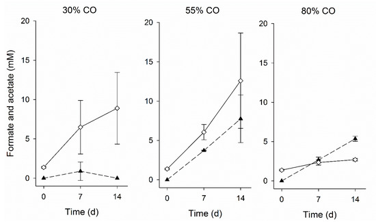 Formate (▲) and acetate (◊) production during the batch tests with biomass from day 54 incubated with 30%, 55%, and 80% CO in the gas phase. The vertical bars indicate the standard deviation among triplicates.