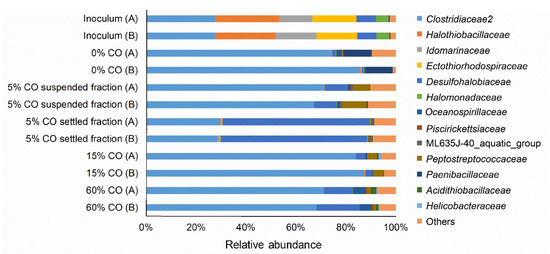 Microbial 16S rRNA relative abundance on family level in the inoculum and biomass samples from the end of the runs without CO (day 46), with 5% CO (day 123), with 15% CO (day 216), and after the spike with 60% CO (day 218). For the samples of day 123, the suspended and settling fractions were separated and analyzed separately. A and B represent duplicates for the corresponding day. OTUs with less than 0.5% relative abundance were grouped in “others.”
