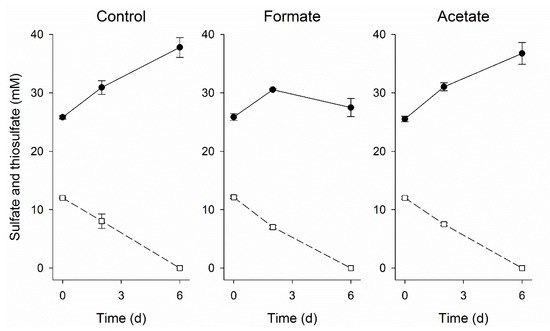 Sulfate (●) and thiosulfate (□) conversion during the batch tests with biomass from day 90 incubated with 25% CO in the gas phase. The control test was performed with regular medium while 25 mM formate and 12.5 mM acetate were added to the formate and acetate experiments, respectively. Vertical bars represent the standard deviation among triplicates.