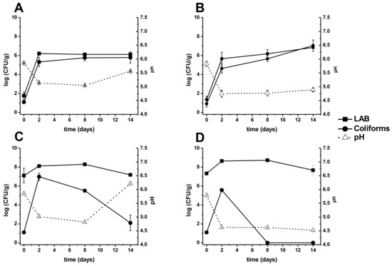 Microbiological and pH analyses: (A) acid whey fish (AwF); (B) acid whey fish molasses (AwFM); (C) acid whey fish lactic acid bacteria Lr (AwFLr); (D) acid whey fish molasses lactic acid bacteria Lr (AwFMLr). Filled squares represent lactic acid bacteria (LAB); filled circle represents coliforms; open triangles represent the pH. Error bars represent the standard deviation of three independent experiments.