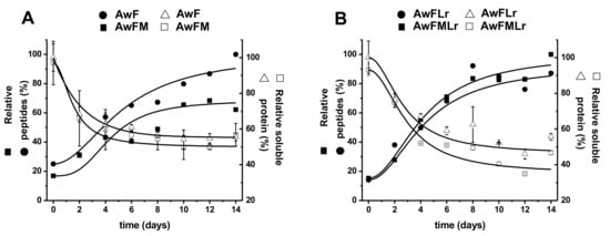 Soluble protein and peptide dynamics: (A) AwF and AwFM; (B) AwFLr and AwFMLr. Open squares represent relative soluble protein content; open triangles represent relative soluble protein content; filled squares represent relative peptide concentration; filled circles represent relative protein concentration. Error bars represent the standard deviation of three independent experiments.