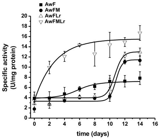 The specific activity confirms these results since it showed a higher, but not significant (p < 0.05), activity within the treatments containing molasses and the LAB starter. Nevertheless, the treatment with the LAB starter (AwFLr and AwFMLr) had a significant (p < 0.05) influence over the yield of peptide concentration at the end of the fermentation as well as a more controlled and defined process. In comparison, the treatments that did not have a starter (AwF and AwFM) showed more variation in the yield of protein hydrolysates explained partially by the metabolism of the natural microbiota of the raw ingredients (Figure 3).