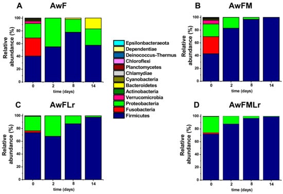 Furthermore, the beta diversity analysis carried out showed a notable separation of control samples (AwF and AwFM) when comparing the diversity, presence, and abundance of operational taxonomic units (OTUs) among the treatments. The phylogenetic distribution of the fermentation systems at the phylum level was first (day 0) lead by Firmicutes and Proteobacteria, which alone represented around 50–60% of the relative abundance of the bacterial communities. However, as the fermentation continued, Firmicutes outcompeted the remaining phyla until it dominated the system by day 14. It is important to mention that, as seen in Figure 4, molasses affects the relative abundance of bacterial diversity, as does the use of a starter. Other phyla seen across the samples are Fusobacteria and Bacteroidetes, especially in the treatments with no starter (AwF and AwFM).