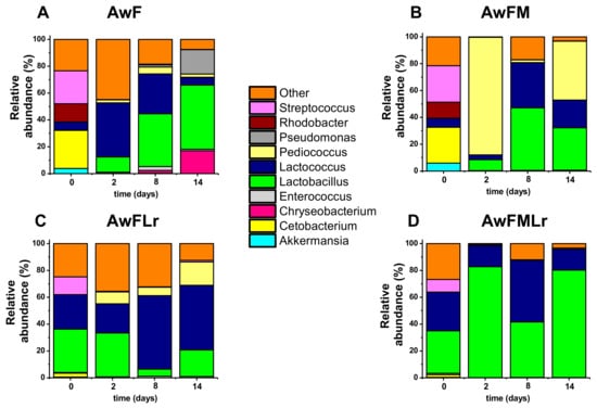 Deeper in the taxonomy characterization, at the genus level, we focused on the top ten; however, Lactobacillus and Lactococcus were the most abundant, followed by Pediococcus, Streptococcus, Cetobacterium, Rhodobacter, Pseudomonas, Chryseobacterium, and Enterococcus (Figure 5). As expected by day 14, Lactobacillus is the predominant genus overall. However, as described above, the samples that did not contain the starter (AwF and AwFM) or the molasses had a more diverse genera distribution overtime. Only the treatment that contained molasses and starter behaved as expected (AwFMLr). Although the environmental conditions of development for these communities changed over time, it was also expected to be led by a lactose fermentative bacterium. Nonetheless, the species within these genera are well known to be heterofermentative; thus, a homogeneous community is desired.