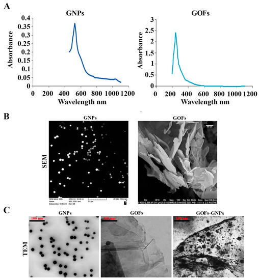 (A) UV-VIS spectroscopy analysis and (B) Scanning Electron Microscope (SEM) images of gold nanoparticles (GNPs) and graphene oxide flakes (GOFs); (C) Transmission Electron Microscope (TEM) images of GNPs, GOFs (exfoliated, single-layer sheets), and a mixture of GNPs and GOFs.