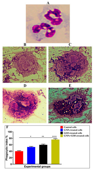 Neutrophil isolation medium (5.0 mL) was taken into a centrifuge tube; the blood sample (5.0 mL) was carefully added, and centrifuged (2000 RPM, 10 min, 4 °C). The detailed procedure was followed according to the reported protocol [49]. The cells were counted and adjusted to 1 × 106/mL, and pretreated with GNPs and GOFs (1 h, 10 µg/mL each), followed by infection with S. aureus (multiplicity of infection (MOI)—1:100) and incubation (37 °C, 30 min). The phagocytic index was calculated using the following equation: