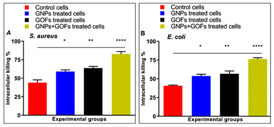 S. aureus and E. coli were cultured (37 °C) in Lysogeny Broth (LB) broth until the mid-log phase (optical density (OD), 0.4–0.6). Following centrifugation (3500× g, 15 min, 4 °C), sterile Phosphate Buffered Saline (PBS) was used to wash the pellets 3 times. The concentration of the re-suspended bacteria was determined by measuring OD at 550 nm. The BMDMs were used alone or pretreated with GNPs, GOFs, and combined GNPs and GOFs mixture at 10 µg/mL each. The cells were then infected with S. aureus or E. coli at M.O.I. 1:50 and incubated at 37 °C for 60 min. The BMDMs were treated with lysis buffer. To determine total and extracellular bacterial killings, serial dilutions (10×) of the lysates were incubated with Luria-Bertani (LB) agar plates (37 °C, 24 h). Values of the total and extracellular bacterial killings were used to derive the intracellular bacterial killing values.