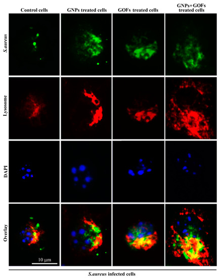 GNPs and GOFs enhanced co-localization between Lysotraker and Fluorescein isothiocyanate (FITC)-conjugated Staphylococcus aureus. Co-localization appeared in yellow, lysosomes labelled with Lysotracker appeared red, cell nuclei were stained with 4′,6-diamidino-2-phenylindole (DAPI) appeared in blue, scale bar, 10 µm. The scale bar is identical for all, as the magnifications are the same for the images.
