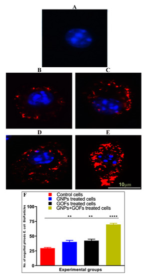 GNPs and GOFs enhanced phagocytosis of pHrodo E. coli BioParticles. (A) Control, untreated BMDMs cells stained with DAPI (blue). (B) Cells treated with pHrodo E. coli BioParticles (red) alone. (C) GNP-pretreated cells at a concentration of 10 µg/mL then treated with pHrodo E. coli BioParticles. (D) GOF-pretreated cells at a concentration of 10 µg/mL then treated with pHrodo E. coli BioParticles. (E) GNP- and GOF-pretreated cells at a 10 µg/mL concentration each then treated with pHrodo E. coli BioParticles. (F) The graph represents the number of engulfed of pHrodo E. coli BioParticles. Cells were quantified in 10 fields using Image J software version 1.43 (U.S. National Institutes of Health, Bethesda, MD, USA). Data are represented as mean ± SE. Statistical significance by one-way ANOVA (p < 0.0001) followed by posthoc testing using Tukey’s multi group comparison with control cells: ** p < 0.01, **** p < 0.0001 indicate statistically different from control BMDMs.
