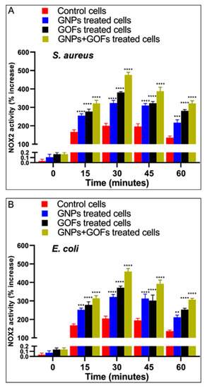 The phagocytes were able to kill the ingested bacteria through the crucial mechanism of the activation of the NOX2 enzyme complex, leading to ROS production (reactive oxygen species), i.e., superoxide anions. In the membranes of the phagosomes, these bacterial anions are produced by the activity of the NADPH oxidase complex NOX2, thereby leading the phagocytes to undergo more active killing of the ingested bacteria [59,60]. To test the NOX2 and ROS activities in the phagocytes, superoxide anion production by murine BMDMs was assayed. Compared with control BMDMs, the GNP- and GOF-pretreated BMDMs showed increased ROS and NOX2 activities, supposedly with the substantial release of superoxide anions in response to either S. aureus or E. coli presence (Figure 7 and Figure 8). Thus, the pretreatment of BMDMs with GNPs and GOFs was associated with increased NOX2 activity in response to improved ROS production, which is possibly one of the principal mechanisms leading to enhanced killing clearance of bacteria [61]. However, other mechanisms cannot be ruled out, since cell wall damage [62] and DNA/RNA destruction [63] was not monitored. In most probability, bacteria trappings in the aggregated GOFs and cell wall damage by the sharp edges of the GOFs pieces cannot be ruled out [64,65]. The DNA/RNA damage needs further work to estimate the damage to the nucleic acid component.