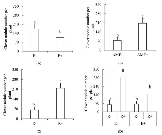 (A–D) The influence of endophytic fungi, AMF and rhizobia on the number of nodules. E+, endophyte-infected tall fescue; E−, endophyte-free tall fescue; AMF+, AMF-inoculated; AMF−, AMF-free; R+, rhizobia-inoculated; R−, rhizobia-free. Different small letters indicate significant differences between treatments (p < 0.05).