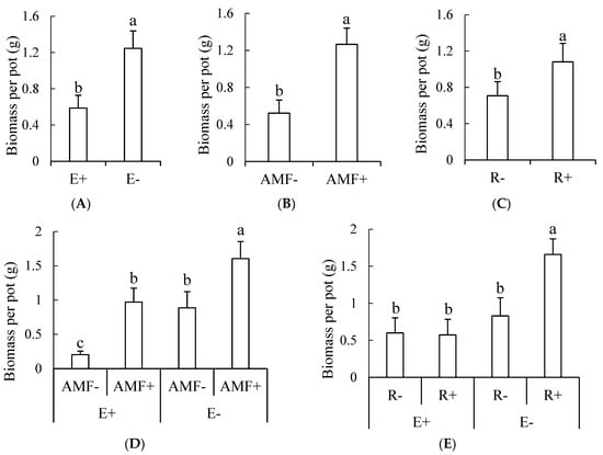 (A–E) The influence of endophytic fungi, AMF and rhizobia on the biomass of clover. E+, endophyte-infected tall fescue; E−, endophyte-free tall fescue; AMF+, AMF-inoculated; AMF−, AMF-free; R+, rhizobia-inoculated; R−, rhizobia-free. Different small letters indicate significant differences between treatments (p < 0.05).