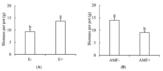 Endophytic fungi and Gm inoculation significantly affected the biomass of tall fescue (p < 0.001). Endophyte infection significantly increased the biomass of tall fescue (Figure 3A) while Gm inoculation significantly decreased the biomass of tall fescue (Figure 3B). The effect of rhizobia inoculation on the biomass of tall fescue was affected by endophyte infection and the beneficial effect of rhizobia inoculation occurred only in E+ plants (Figure 3C).